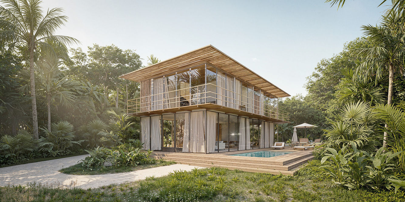 Implantado em dois lotes com parâmetros urbanísticos distintos — um à beira-mar e outro na área continental — o projeto busca beneficiar o território sem romper sua lógica ambiental e social. O lote de frente para o mar abriga a recepção, os 44 bangalôs e o beach club com restaurante. Os bangalôs se organizam a partir de um eixo central, formando uma leitura de vila e privilegiando a vista para o mar, com quatro tipologias integradas ao verde e ao clima local.