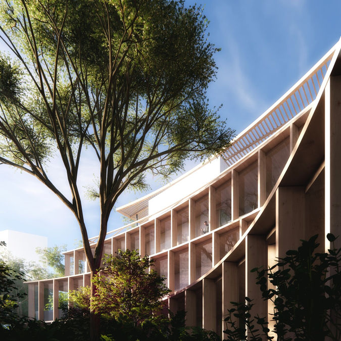 Para a estrutura primária do edifício, foi utilizada exclusivamente madeira engenheirada, tanto na versão MLC, que atua como pilares e vigas, quanto em CLT, que funciona como planos de piso e parede. Essa escolha permite que a estrutura primária de MLC garanta a máxima flexibilidade dos espaços, enquanto o CLT atua como vedações, mantendo a coerência e a funcionalidade do conjunto arquitetônico.